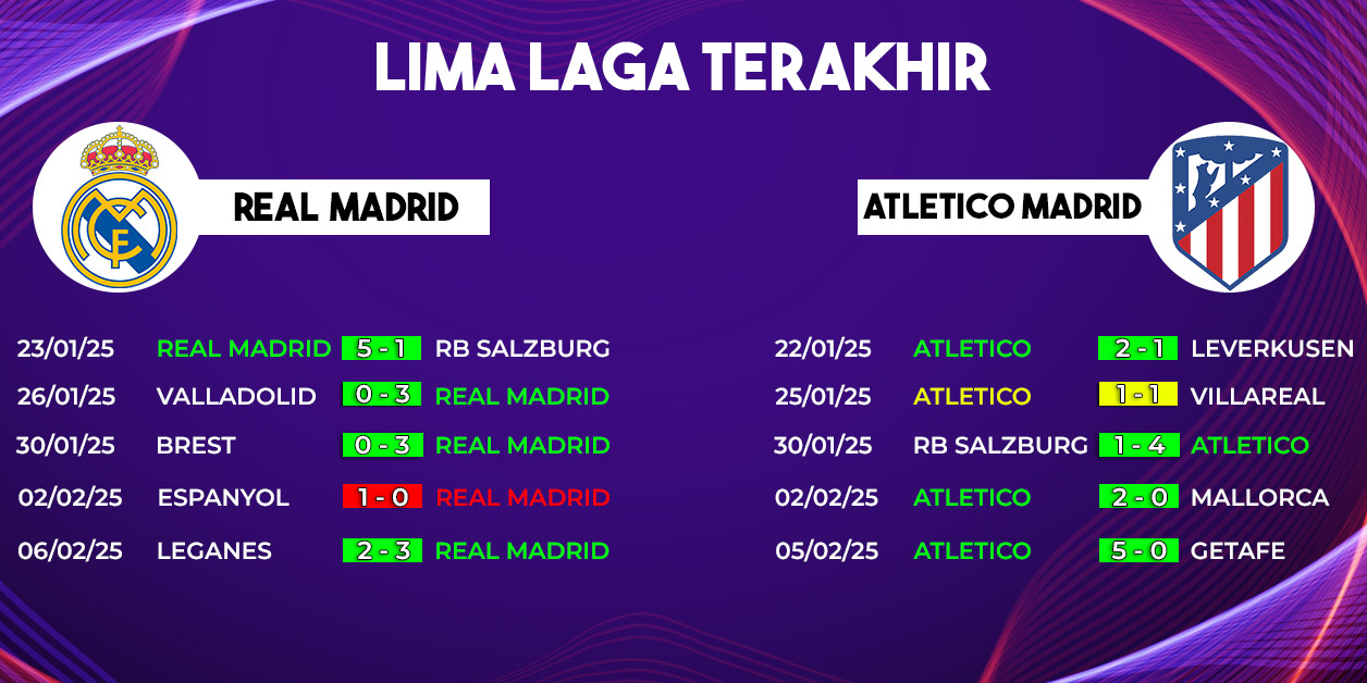 Pertandingan panas akan tersaji di pekan ke-23 La Liga 2024/2025 saat Real Madrid menghadapi Atletico Madrid di Santiago Bernabeu. Duel Real Madrid VS Atletico Madrid dijadwalkan berlangsung pada Minggu, 9 Februari 2025, pukul 03.00 WIB, dan dapat disaksikan melalui live streaming di Vidio.