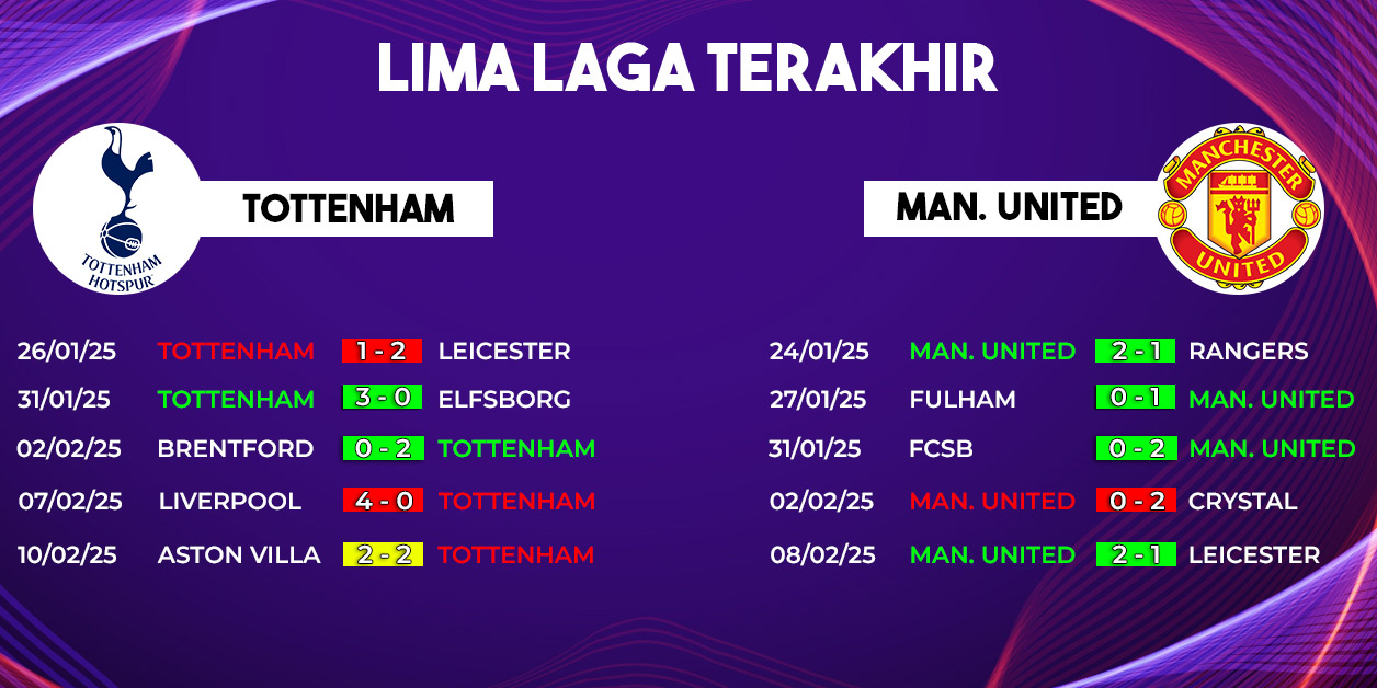 Tottenham Hotspur dan Manchester United akan berhadapan dalam laga seru di Tottenham Hotspur Stadium pada pekan ke-25 Premier League 2024/2025. Pertandingan Tottenham vs Manchester United dijadwalkan berlangsung pada Minggu, 16 Februari 2025, pukul 23.30 WIB, dan dapat disaksikan melalui live streaming di Vidio.